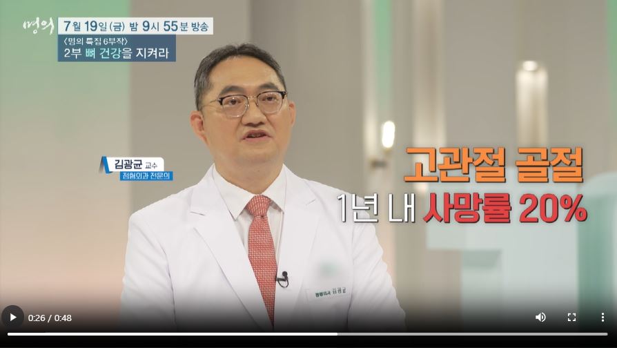 여러분 노년기의 고관절 골절사고가 얼마나 위험한지 아시나요? 고관절 골절사고를 당했을때 1년이내 사망률이 20% 라고 합니다(건양대 김광균교수) 뼈건강을 위해 50대부터 챙겨야할 뼈건강 필수 영양제를 전해드립니다.