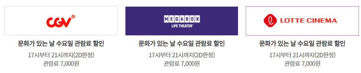 문화가 있는날 중에서 가장 활용도가 높은 CGV, 메가박스, 롯데시나메 영화관의 영화티켓 50% 할인입니다. 직장인 퇴근시간에 맞춰서 17시~21시 사이에 상영되는 2D 영화에 한해서 50% 할인된 금액인 7,000원에 이용가능합니다. 아래 버튼을 통해서 각 영화관 별 영화시간표와 빠른 예매까지 한 번에 가능합니다. 매달 마지막주 수요일은 예매율이 아주 높습니다. 서두르세요!!