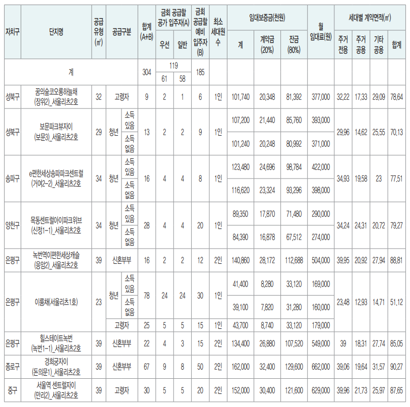 임대 대상 주택수는 총 304호 입니다. 총 304개의 서울시내 브랜드 아파트를 임대하여 내집처럼 생활 할 수 있습니다.